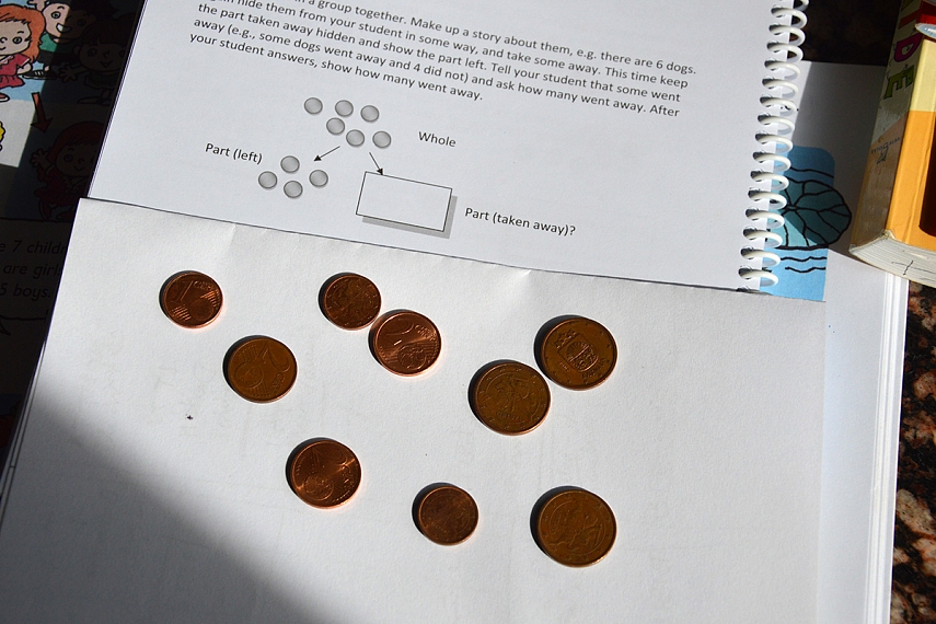 Išdeliokit ant stalo (arba pieškit) 7 monetas: "Buvo 7 monetos". Tuomet visas monetas uždenkit. Išstumkit 2 monetas (5 lieka paslėptos): 2 monetas išleidau. Kiek liko? Bandykit su kitais skaičiais ir objektais.