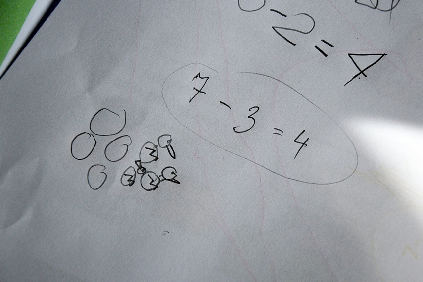 Pavyzdžiui istorija su saldainiais. Turėjau 7 saldainius, liko 5, kiek suvalgė Matas? Rašau ant popieriaus 7 - = 5. Prašau, kad Emilija parašytų arba pasakytų, koks skaičius bus tuščioje vietoje. Išbandau su visomis keturiomis situacijomis. Pačiai pabaigai palieku sunkiausią - užrašau atimtį skaičiais ir nebepasakoju istorijos. Ir žinote kas nutinka? Emilija viską išsprendžia. O ten kur neišsprendžia... nusipiešia sau istoriją... ir išsprendžia tuomet. Vienokiu ar kitokiu būdu - teisingas atsakymas garantuotas. Genialu.
