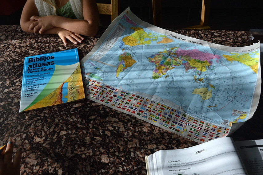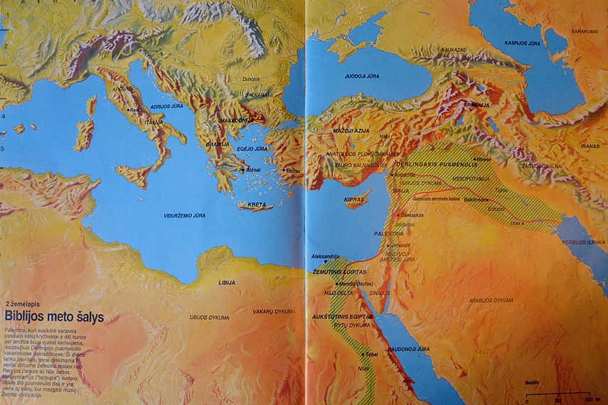 Prisimename visus žemynus (tam naudojam smagią dainelę), įvardinam vandenynus. Tuomet randam Izraelį - tai atskaitos taškas. Emilija visada paklausia, kur yra Lietuva. Randame Lietuvą. Tuomet atsiverčiam Biblijos atlasą ir tvirtinam savo geografijos žinias toliau: aš klausiu, o Emilija rodo. Kolkas išmokome šias vietas / vandens telkinius: