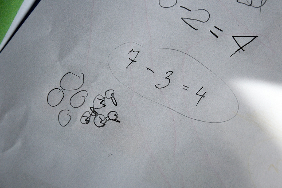 Išdeliokit ant stalo (arba pieškit ką nors popieriuje) 7 kamštelius. Visus uždenkite. Uždengę paimkit 4 kamštelius, atidenkite likutį. Sakykite: "Buvo 7 avys. Naktį atėjo vilkas ir kažkiek avių suvalgė. Ryte atėjau pažiūrėt - liko 3 avys. Kiek avių suvalgė?" Vaikas žinodamas, kad buvo 7 avys, o liko 3, gali nuo 3 skaičiuoti iki 7 (tą darė praeitose pamokose) ir taip sužinoti skirtumą.