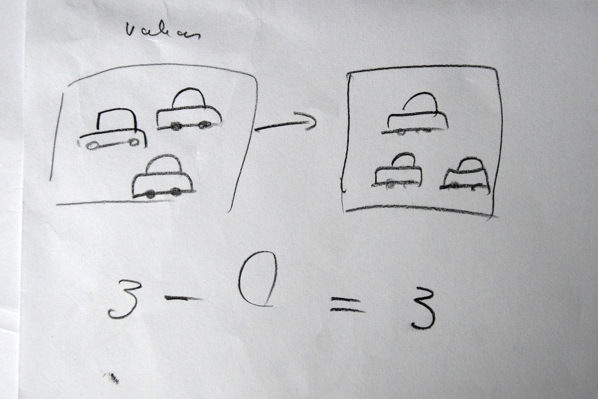 Pabandykit į situacijas įpaišyti NULĮ. Pavyzdžiui "Turėjau 7 saldainius. Paslėpiau nuo vaikų. Vaikai surado. Grįžau ir patikrinau, kad dar vis turiu visus 7 saldainius. Kiek vaikai suvalgė? Nulį. A-0=A." Arba: "Turėjau 5 morkas. Vakare pažiūrėjau, kad krepšelyje morkų nebeliko (tai nulis). Kiek morkų suvalgėm? A-A=0. Tikrai atrodo pakankamai primityviai, bet, patikėkit manim, kai kuriems vaikams būtent tokio tempo ir reikia!