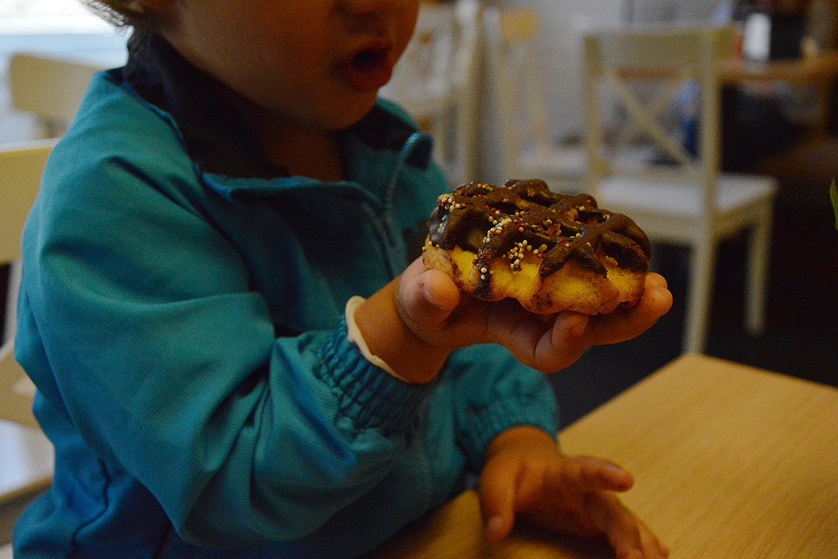 O kai labai labai išalkom, aplankėm mūsų mėgstamą kepyklėlę ir nusipirkom labai pamėgtų vaflių šokolade... ar šokolado su valflių įdaru.