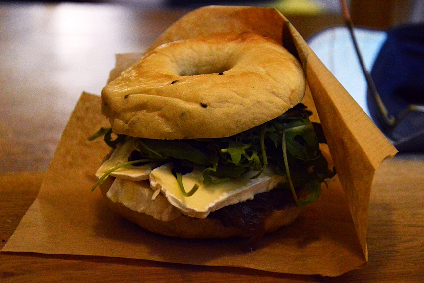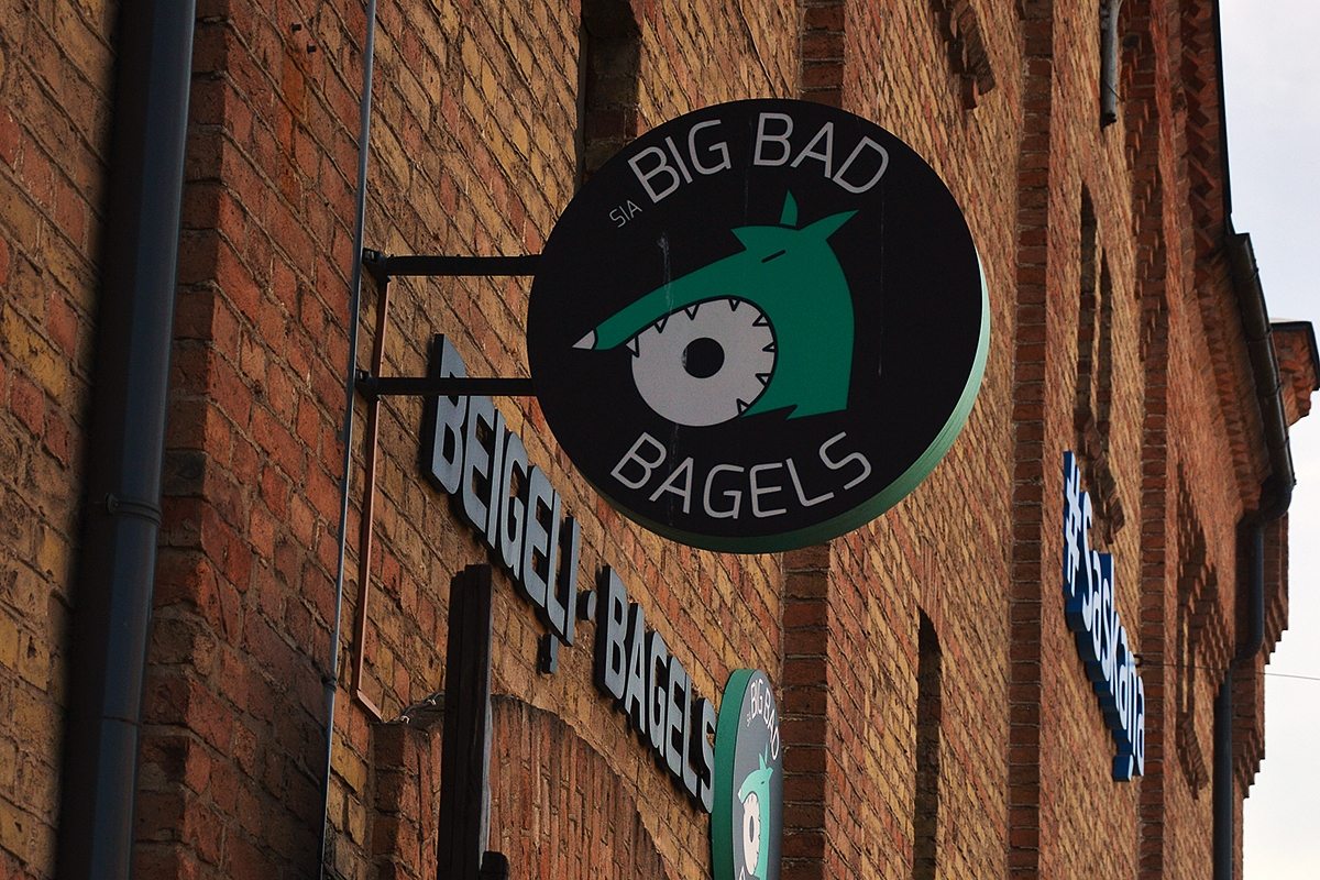 Tiesa, kadangi jau užsiminiau apie maistą, tai pridėsiu dar šį bei tą. Jei dar kartą važiuosiu į Rygą, būtinai ir vėl užsuksiu į nepaprastai nepaprastą beigelių kavinę. Big Bad Bagels. Kas yra beigeliai žino visi, ane? Didelės barankos, perpjautos pusiau ir perteptos kokiu nors įdaru. Amerikoje išmokau beigelius valgyti su Phiadelphia sūreliu (ten kur gyvenau jie kitaip nemokėjo). Vilniuje Beigelių krautuvėlėje teko skanauti beigelių su tepamu sūreliu ir lašiša. O Big Bad Bagels įdarų gausybė tiesiog išmušė iš vėžių. Patys meniu paskaitykite ir seilę pavarvinkite. Aš užsisakiau brie sūrio ir raudonųjų svogūnų čiatnio beigelį, į kurį dar buvo sutalpintas kalnas rukolos ir geras saikas sveikatos (bent jau taip reklamavosi aptarnaujantis personalas). Aurimas sudorojo beigelį su vištiena ir mango padažu. O atsigėrėm labai išgirto svarainių limonado. Tad jei kada būsite Rygoje Maskavas arba Baznīcas gatvėje... ieškokite štai šios iškabos... .