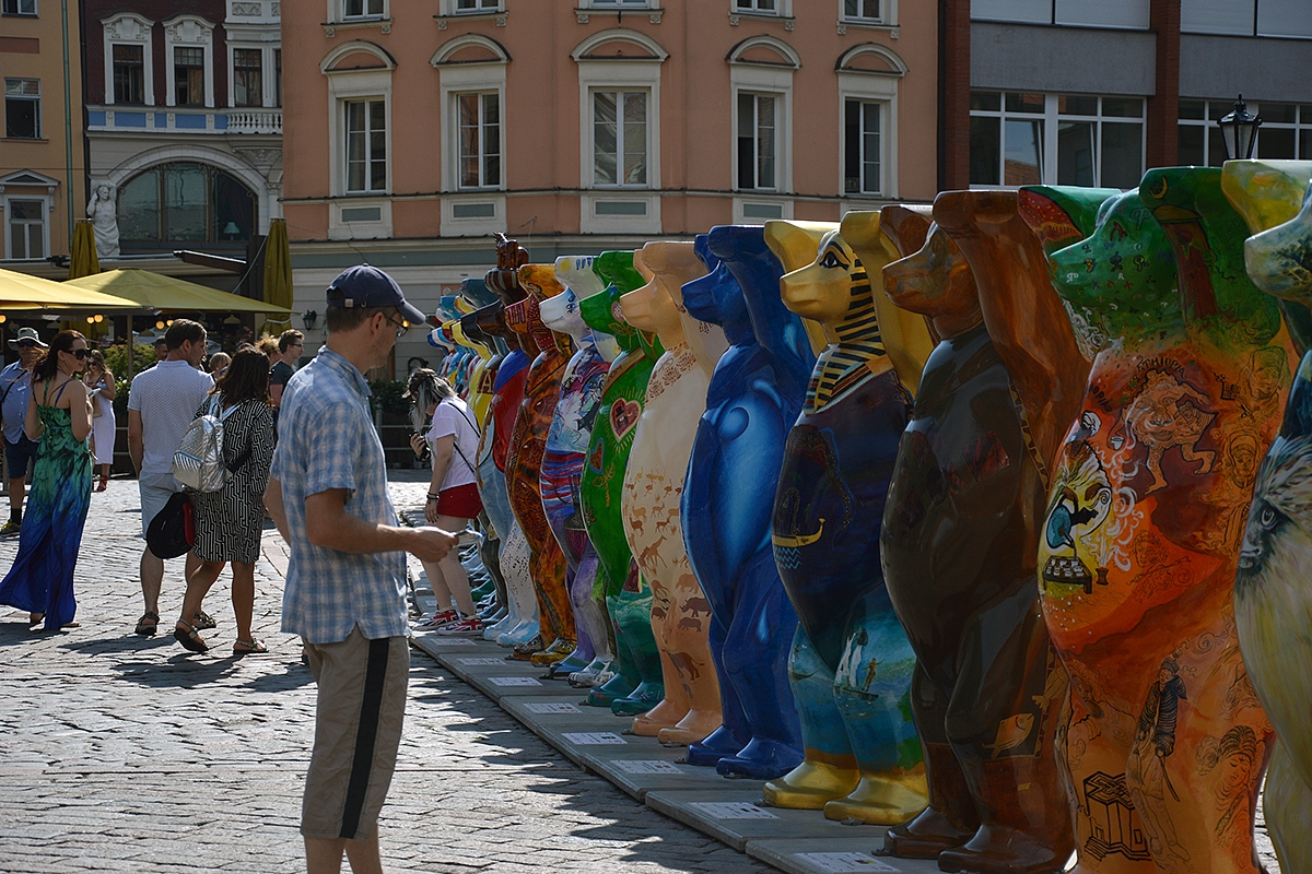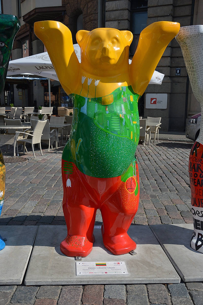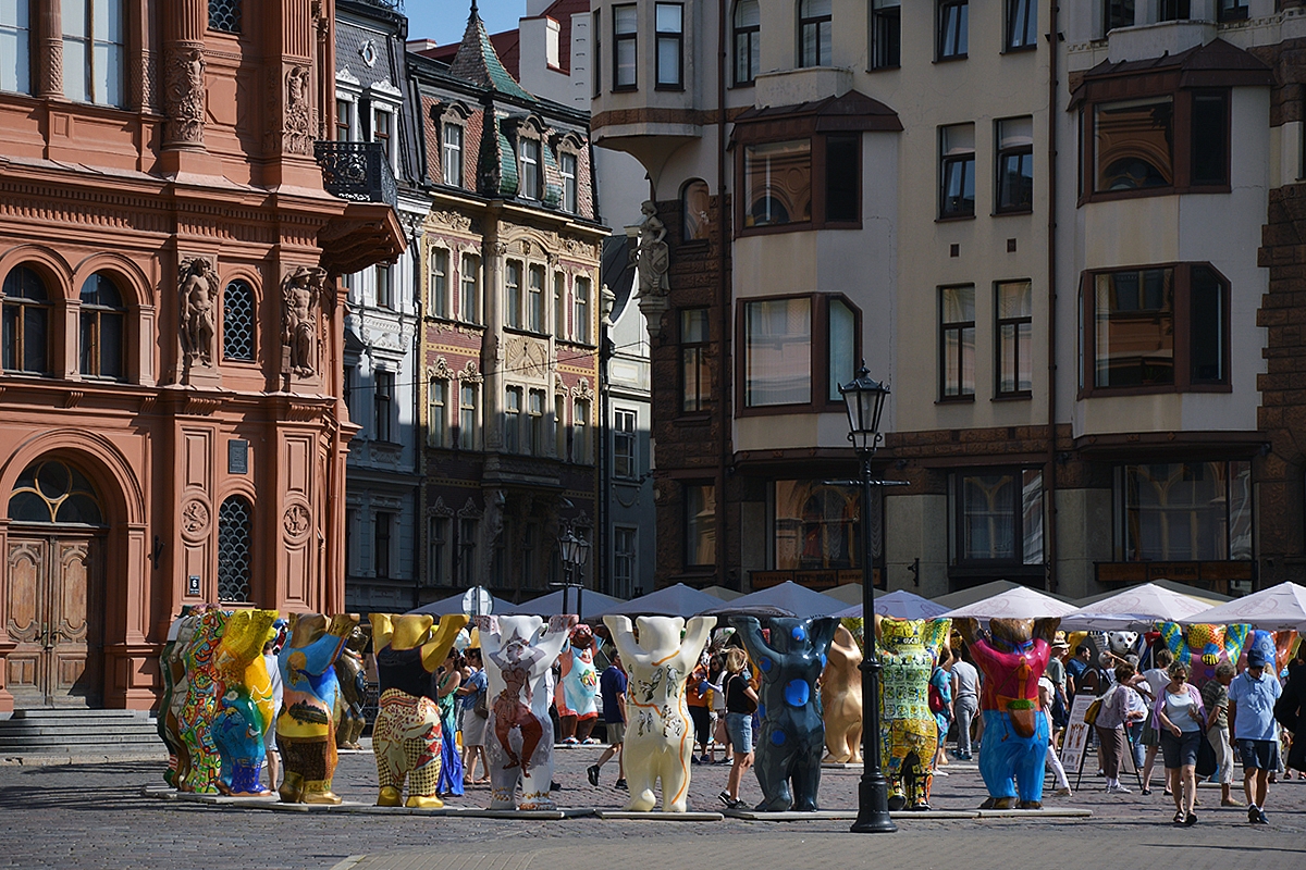 Beklaidžiodami gatvėmis aptikome staigmeną - keliaujančią labdaringą Meškinų skulptūrų parodą (United Buddy Bears). Tiesa, greitai ši paroda iš Rygos iškeliaus.