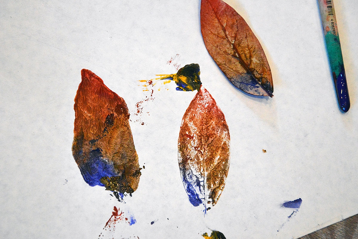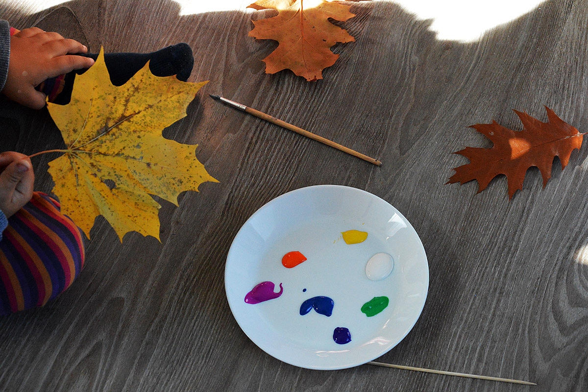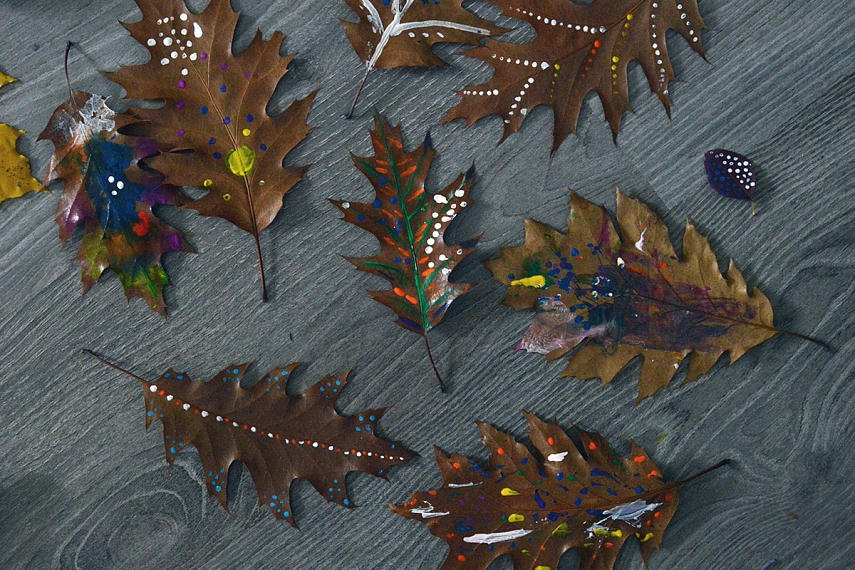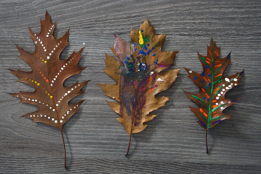 Ant lapų geriausiai piešiasi akriliniais dažais (išdžiūvę nepraranda ryškumo, tačiau labai tepa rūbus) ir plonais teptukais arba bambukiniais iešmeliais; tiesa, geriausi - raudonojo ąžuolo, kriaušės lapai... dėl patvarumo: