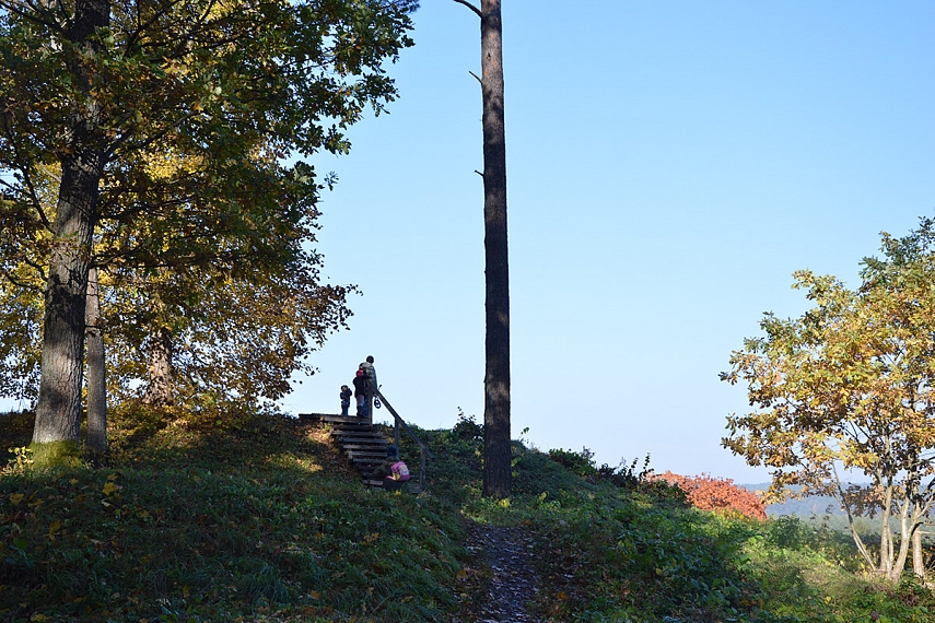 Ir į Stirnių piliakalnį lipom, žinoma, ne laiptais... kam laiptai, jei galima kopti stačiu šlaitu... Emilija, Eglė ir pilvas.