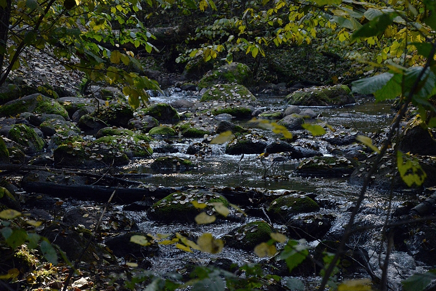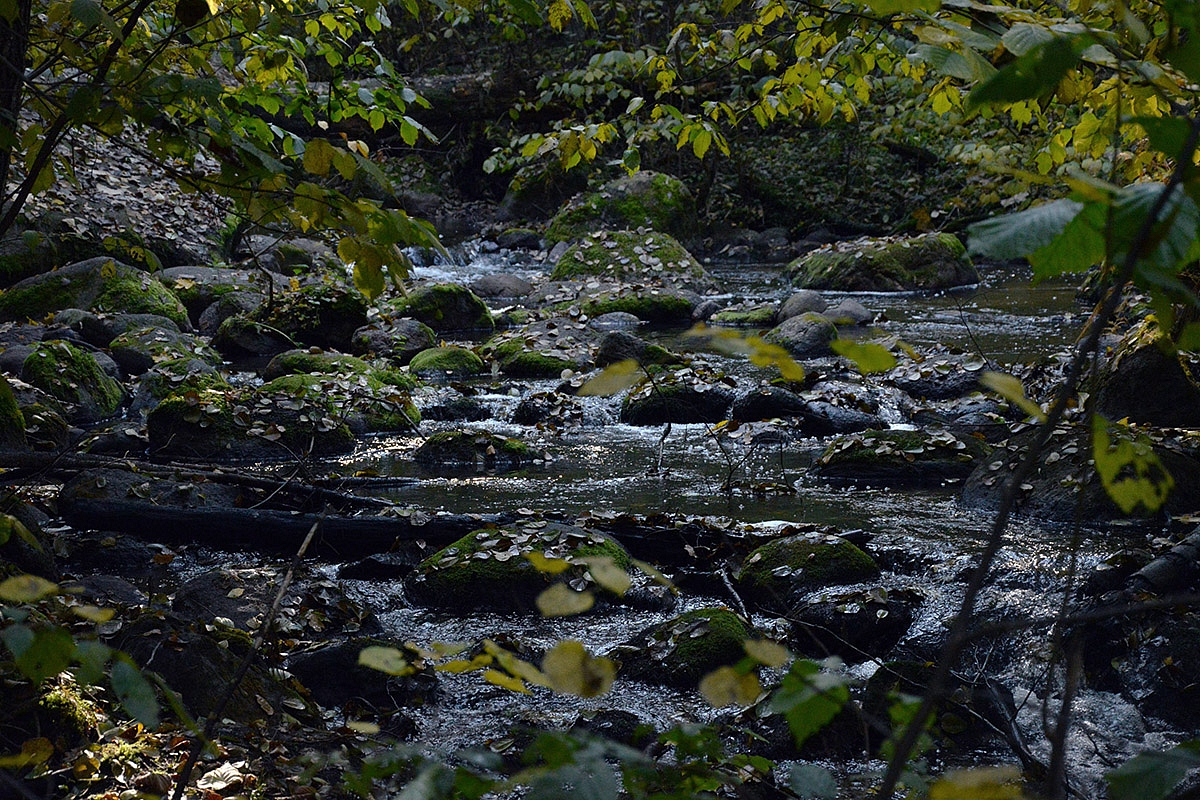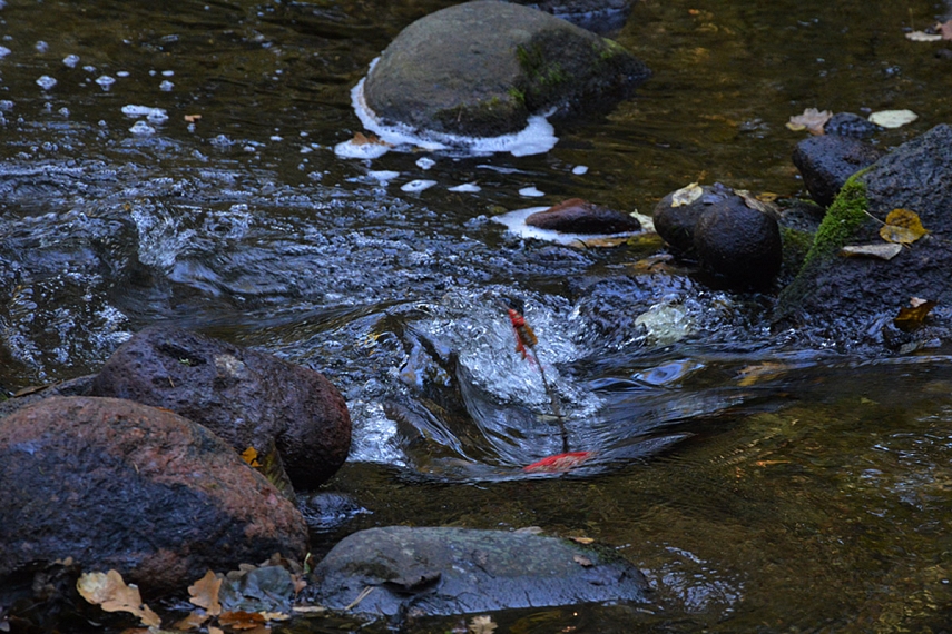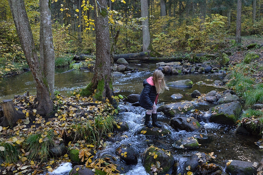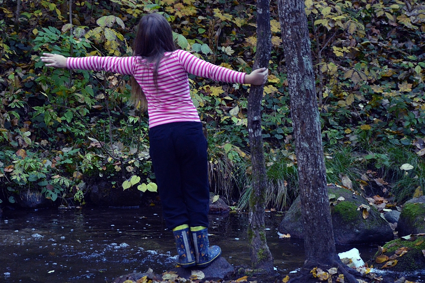 Gamtinis intarpas. Savaitgalį keliom valandom išlekėm į gamtą... visai čia pat - į Saidės pažintinį taką. Žinoma, savo taip visuomet trokštamos vienatvės ir klaikiai laukinės gamtos neradom, tačiau vaikams patiko... nes gavo "ir nuotykių, ir pavojų" patirti. Saidės upelis - labai sraunus ir jame daug akmenų, todėl vasarą vaikams turėtų būti baisiai smagu pabraidyti, tačiau ir rudenį smagumų netrūko. Einant link Saidės akmens, (kuris nėra kažkuom ypatingas... ten tik labai gražus Neries vingis atsiveria) per upelį nutiestas toks pustiltis iš keturių plastikinių vamzdžių. Pavyko vaikams mane įtikinti, kad per tą tiltelį privalome pereiti. Tad ėjom keturiese - mama su pilvu ir trys vaikai. Juokinga buvo - labiausiai turbūt dėl mano pilvo... Kitoj pusėj radom dar daugiau akmenų, ant kurių vaikai tiesiog privalėjo palaipioti. Akmenys, žinoma, visai nepritaikyti mamoms su pilvais, bet vaikams - pats tas.