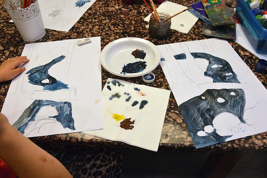 Tikslas buvo toks - pabaigti darbą iki galo. Jį pasiekėm per 1 h ir keliolika minučių. Spaudžiu Emilijai dešinę už jos nevaikišką kantrybę ir uolumą. Be to, labai smagu buvo sudėti piešinius viena šalia kito - įdomūs charakterio skirtumai detalėse pasimatė.