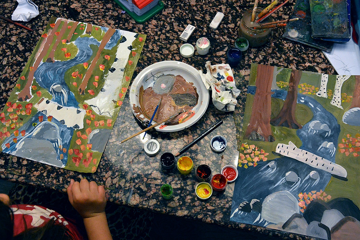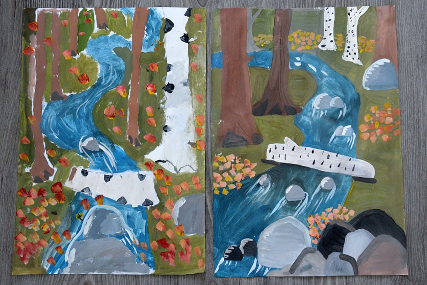 Paskui spalvinome atskirus fragmentus (upelį, medžius, žemę, akmenis).