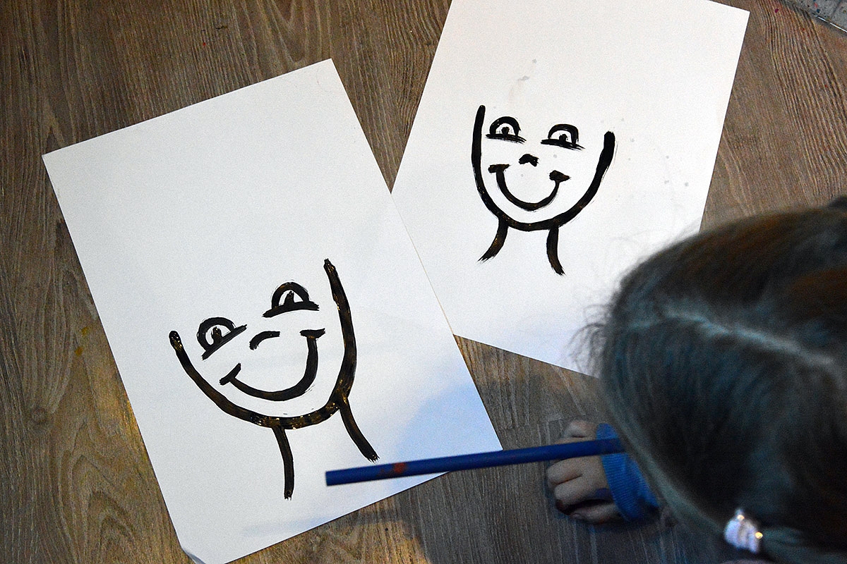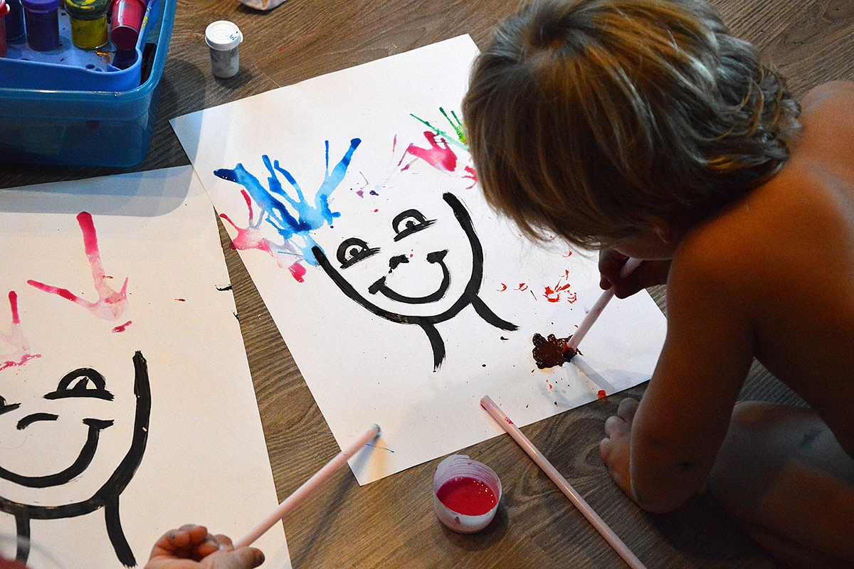 Kitą dieną surengiam eksperimentuves - tiesiog maišom spalvas, spaudžiam, terliojamės nuo galvos iki kojų... Po tokių pasismaginimų nelieka nei vieno švaraus kampelio kambaryje... bet savotiškai išsikraunam: