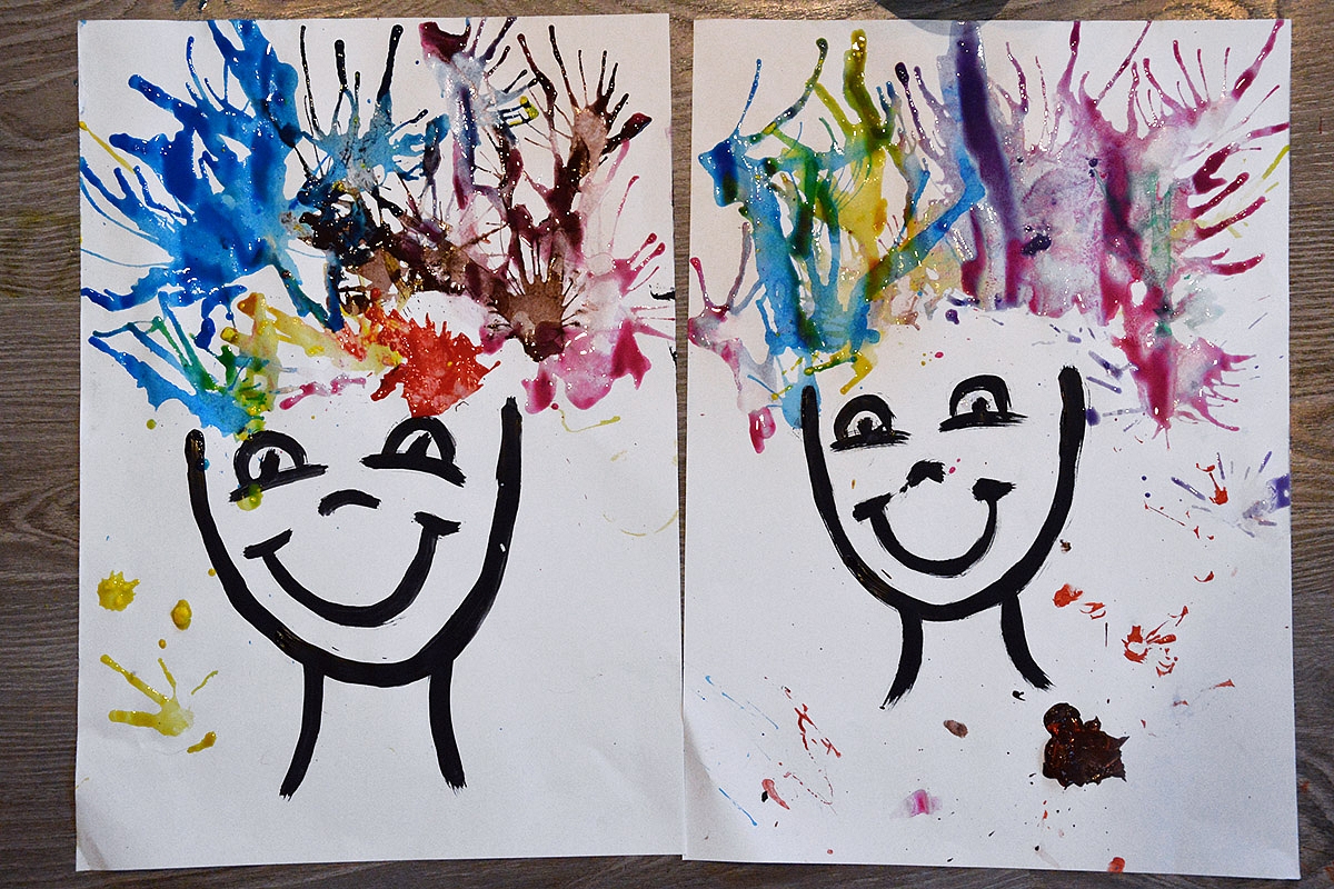 Turbūt neįtikėtina, bet radom laiko ir dar vienai šėlionei - pučiamųjų proga. Darbelis vadinasi - blogos šukuosenos diena. Labai paprastas ir smagus (tik reikia iš anksto pasiruošti dažus):.