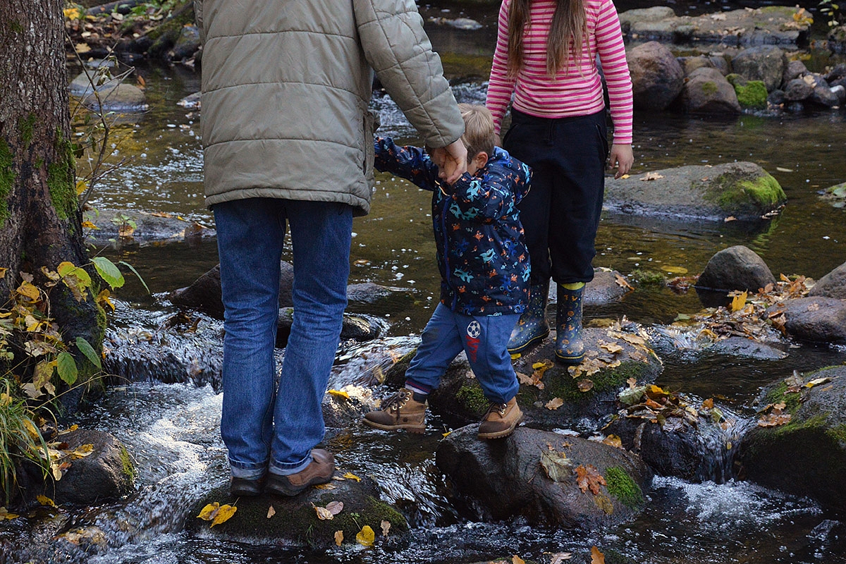 Galiausiai vaikai įtikina tėvus, kad akmenys srauniame upelyje turi būti sulaipioti... tad visi laipioja... Tiesa, šį kartą be Eglės ir be pilvo.