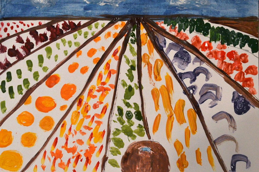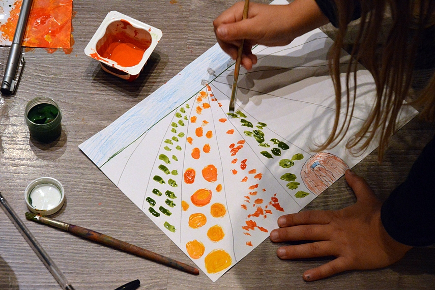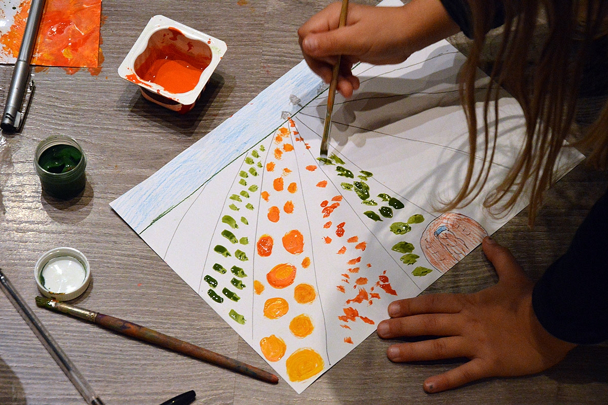 2. Perspektyva darže. Kadangi Sofija beržų daryti nenorėjo, su ja piešėme perspektyvą. Taip pat labai smagus darbelis. Žinoma mažiau rūpėjo perspektyva, o daugiau įvairios daržovės, kurias galima dideliame lauke nupiešti.
