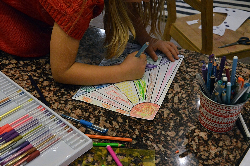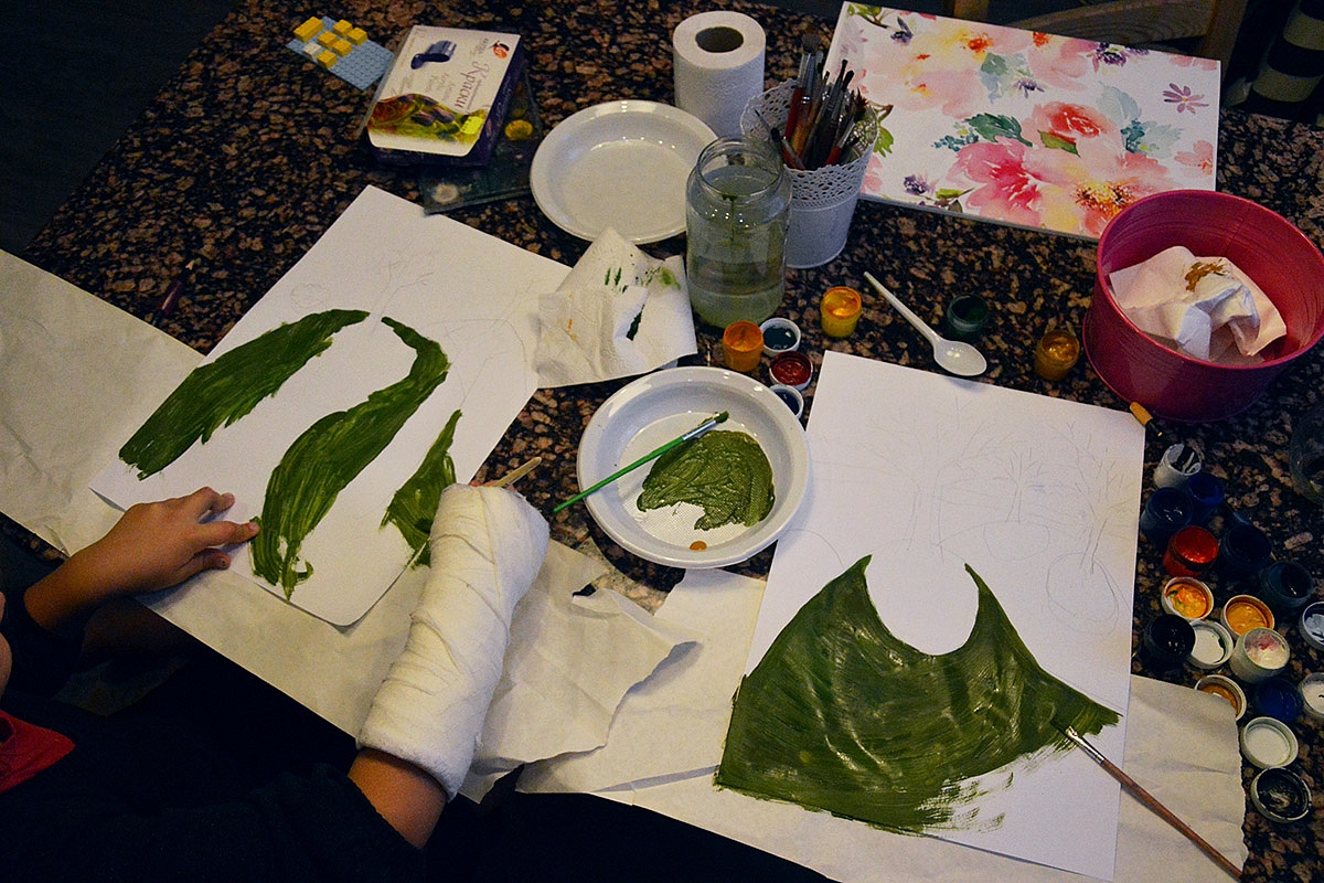 Su rašymu / dailyraščiu kiek apstojom, nes Emilija susilaužė dešinę ranką (batutas, batutas, batutas). Geroji medalio pusė yra tokia: atkrito visoks popierizmas, todėl daugiau laiko praleidom tiesiog kalbėdami, skaitydami, žaisdami, skaičiuodami, dėliodami.
