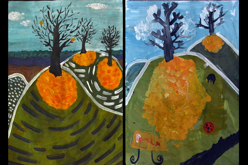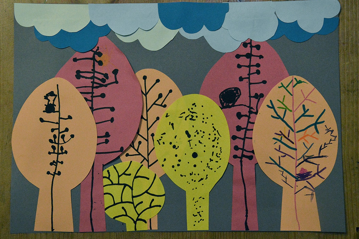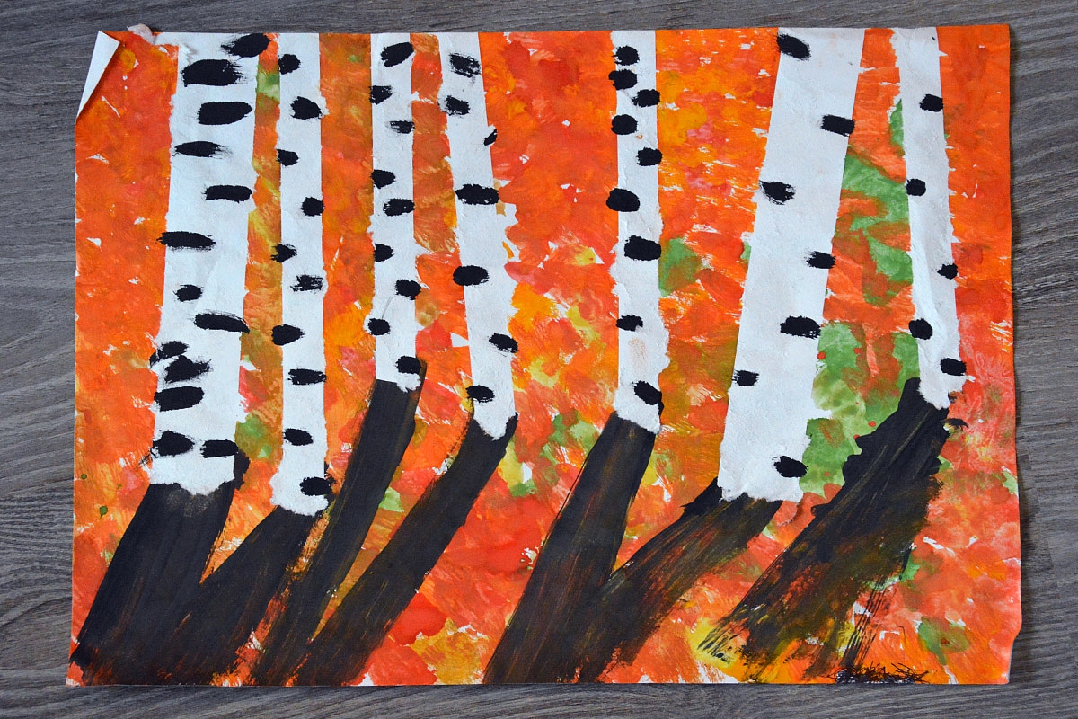 1. Beržai lapų fone. Prieš pradedant reikėtų lengvai nusiimančia lipnia juosta (pvz.tokia gumine elektrikų izoliacija) suklijuoti beržus. Mes naudojom paprastą lipnią juostą, bet vėliau ji sunkiau nusiima. Tuomet guašu tepliojam lapus. Laukiam, kol išdžius. Nuimam lipnią juostą. Marginam beržų kamienus ir piešiam šešėlius. Viskas atrodo maždaug taip: