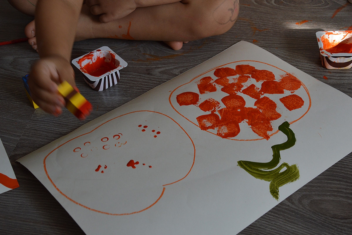 Mažiausiam (nors jau nebeilgai jis bus mažiausias) Matui labiausiai patiko štampuoti moliūgą. Štampavom įvairiausiais daiktais - lego kaladėlėm, kempine, teptukais, pirštais, morkų galais ir t.t. Tik, deja, nespėjau nupleškinti baigto darbo - kažkur iškeliavo...