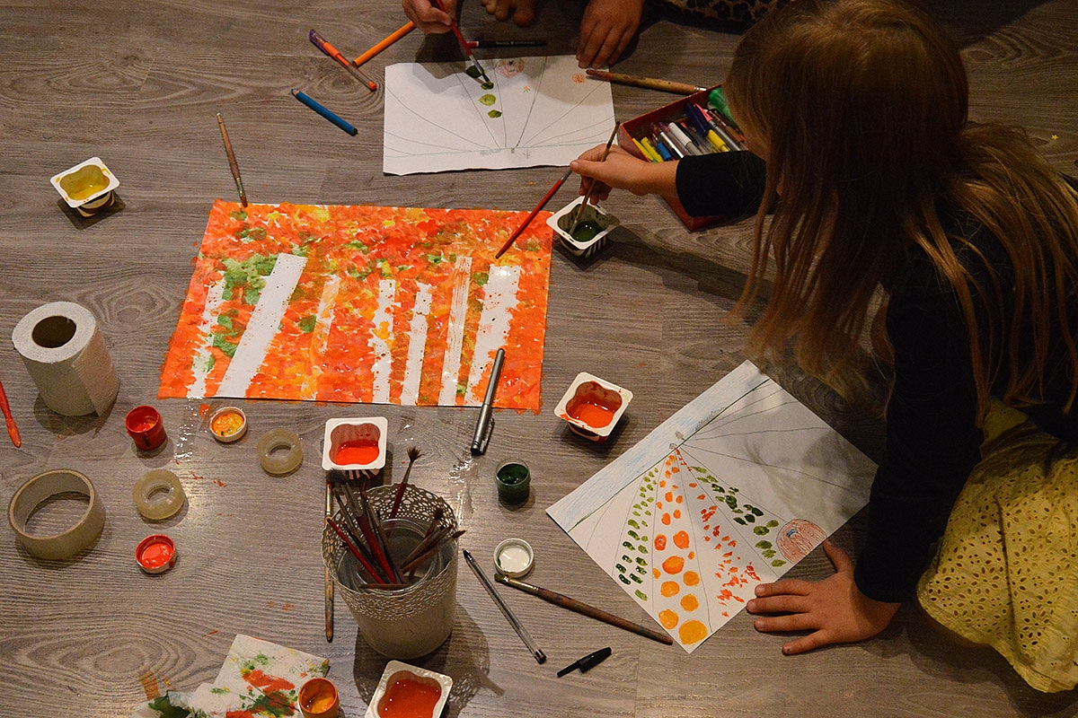 Grįžus namo, reikėjo viską įamžinti. Čia jau mano ir Emilijos nauja tradicija - išsitraukėm dažus, sugalvojom kompoziciją ir piešėm.. nuo pradžios iki galo. Darbavomės apie dvi valandas - mokinomės užbaigti pradėtą darbą.