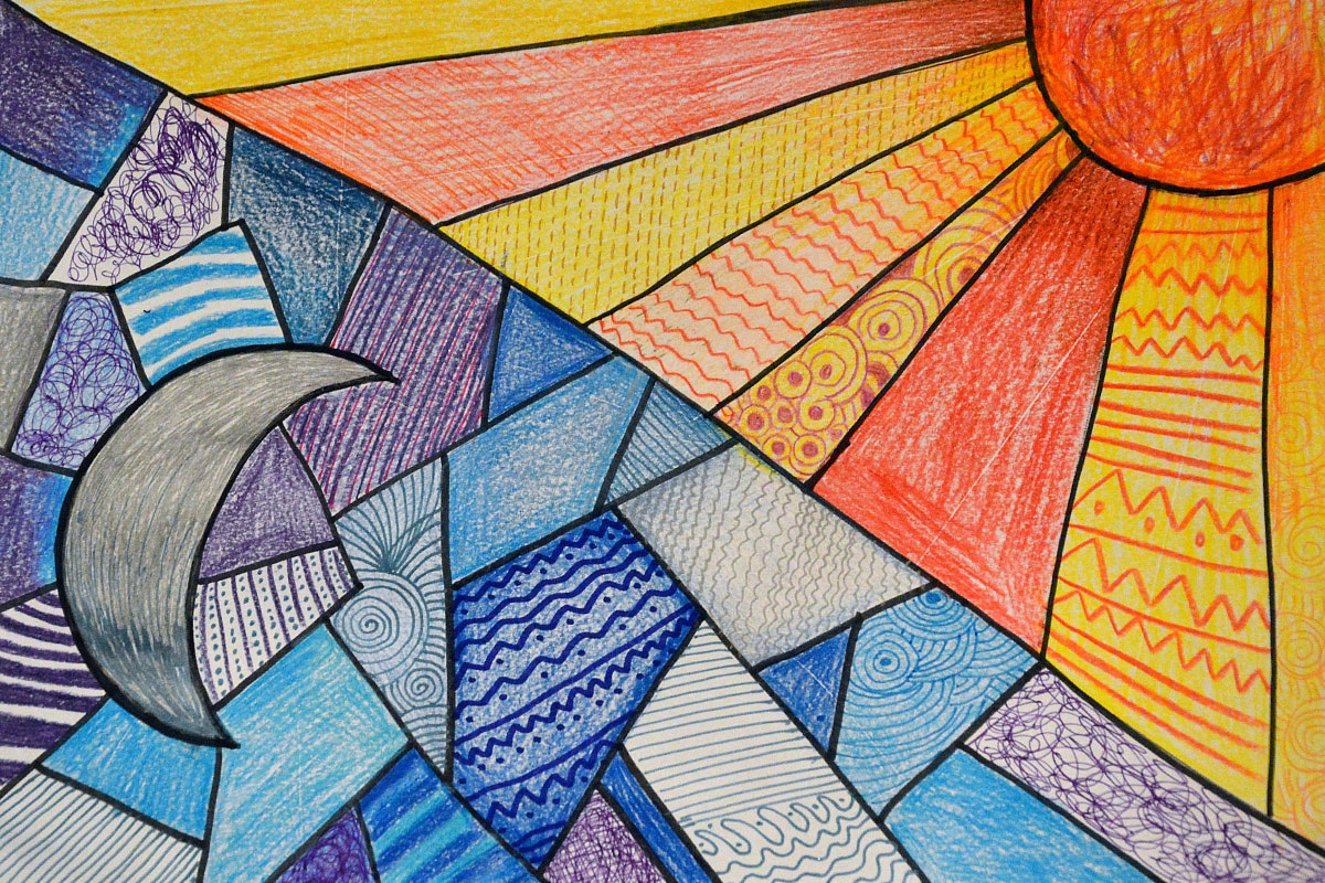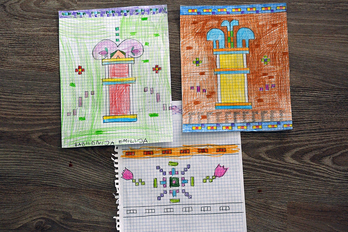 5. Simetriška mozaika. Šiuos darėm besimokindami apie Babiloniją, tačiau pabaigus supratau, kad labai naudinga veikla tiek ugdant simetrijos suvokimą, tiek mokant atidumo, skaičiavimo. Darbelio užduotis tokia: ant languoto popieriaus sukurti pasikartojantį raštą ir kažkokį simetrišką piešinio fragmentą. Simetriją išgaunam taip: aš nupiešiu vieną pusę, o vaikai turi tą patį atkartoti kitoje pusėje. Pasunkinimas: aš piešiu savo lape ir diktuoju vaikams langelių pozicijas, kurias reikia užspalvinti. Galbūt pradžiai vertėtų pabandyti su didesniais langeliais.