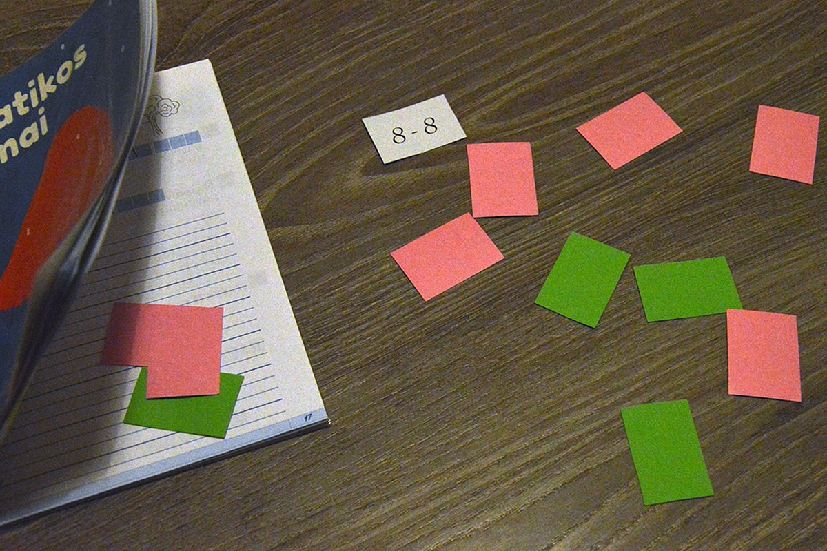 Dvi savaites rišome paskutinis siūlo galus. Pirmiausia reikėjo iki plaukų galiukų įtvirtinti atimtį ir sudėtį iki 10. Kadangi Emilija informaciją doroja vizualiai, pasigaminau paprastas korteles su sudėties ir atimties veiksmais ir su jomis tvirtinom žinias. Kad nebūtų nuobodu, sugalvojom tokį monstriuko žaidimą. Jis žaidžiamas taip: ant stalo išdelioju šusnį kortelių su atimtim / sudėtim. Emilija traukia po vieną ir sprendžia. Jei atsako greitai ir teisingai - tuomet kortelė tenka jai, o jei nežino arba naudojasi pagalbinėm priemonėm (pirštais ar skaičių juosta), tuomet kortelė tenka monstriukui. Kas tas monstriukas? Tai paprasčiausias sąsiuvinys, kuris mėgsta valgyti korteles. Aš pasistengiu padaryti kuo juokingesnius žiaumojimo garsus - to pakanka sudoroti dvidešimt sudeties / atimties veiksmš. Tuomet lengvai nusisekusias korteles dedu į atskirą krūvą, o sunkesnes vėl kartoji kitą kartą. Tiek to žaidimo.